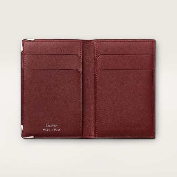 Burgundy calfskin credit/business card holder Exterior: embossed double C logo, golden finish metal corners. Interior: burgundy calfskin, golden Cartier marking,