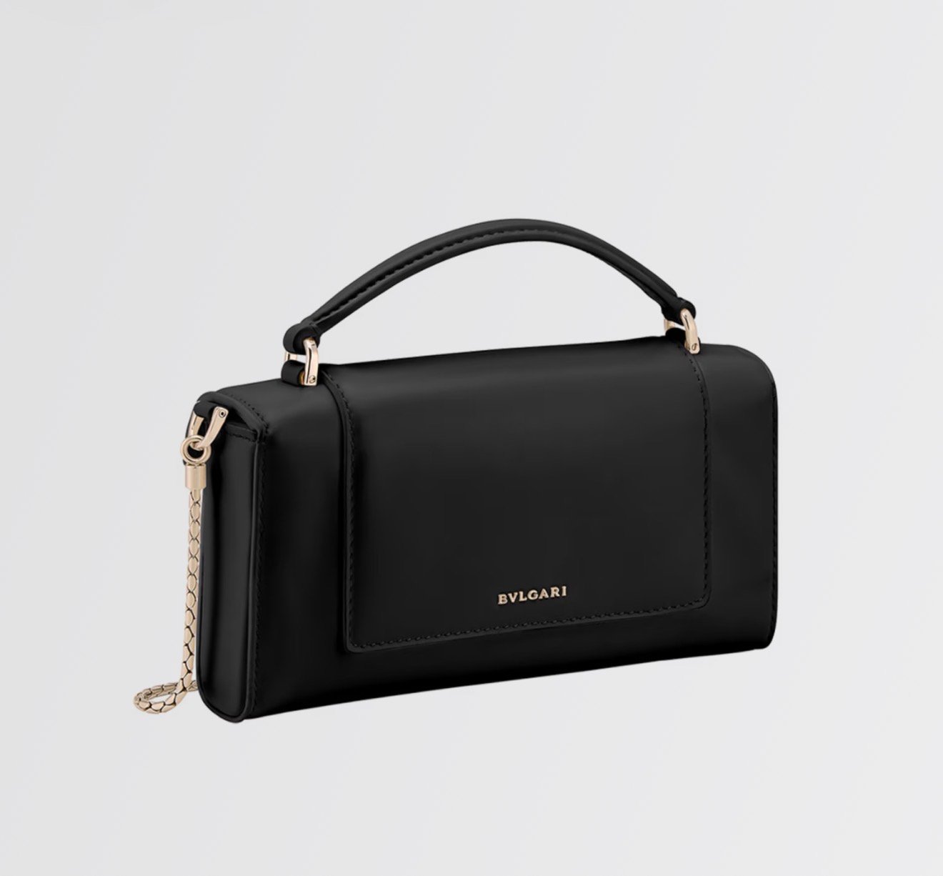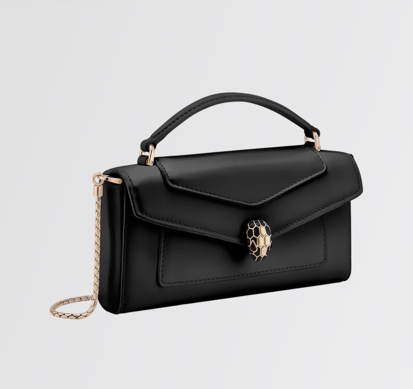 Serpenti Forever phone case in black calf leather with black nappa leather lining. Captivating snakehead magnetic closure in light gold-plated brass embellished with black enamel and light gold-plated brass scales, and black onyx eyes.