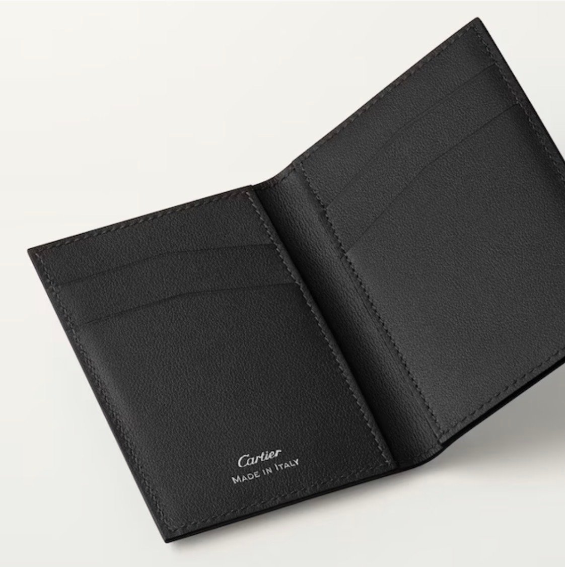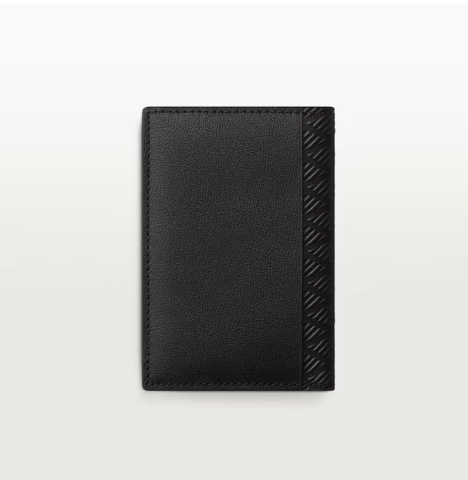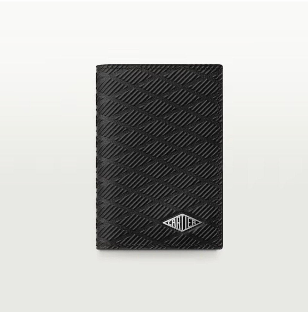 Losange four-credit card holder in black debossed calfskin with gadroon motif, enamel and palladium finish. Exterior: Losange logo. Interior: black calfskin, silver-colored “Cartier” signature, four credit card slots, three flat pockets. Dimensions: Height: 110 mm. Width: 70 mm.