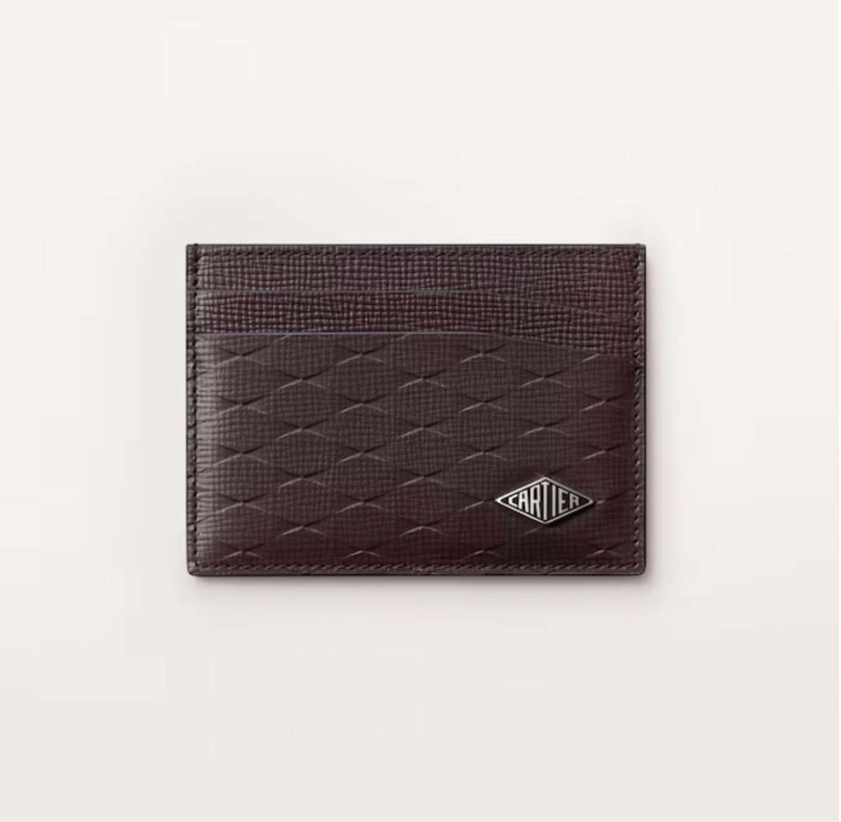 Burgundy calfskin credit/business card holder Exterior: embossed double C logo, golden finish metal corners. Interior: burgundy calfskin, golden Cartier marking,