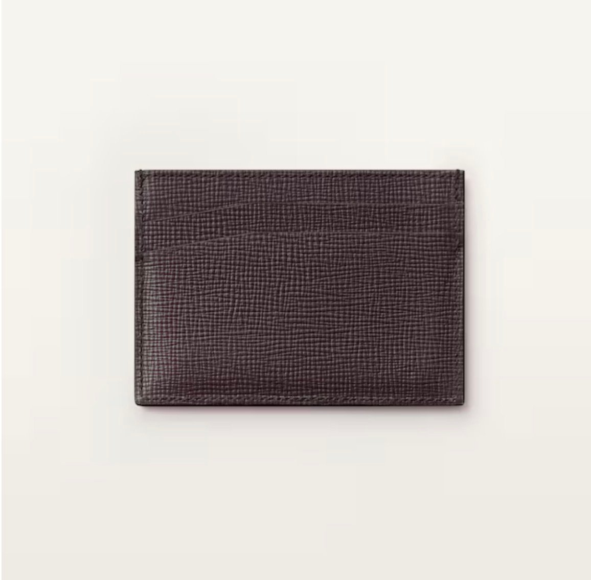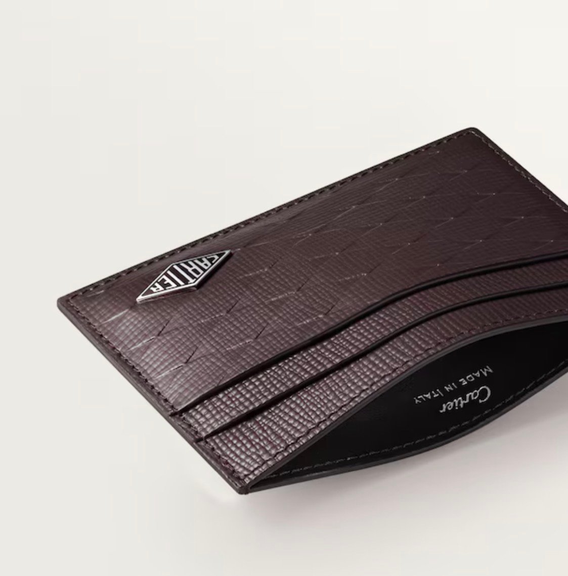 Losange double card holder in ebony textured calfskin, ebony enamel and palladium finish. Exterior: Losange logo. Interior: black calfskin, silver-colored “Cartier” signature, two credit card slots on each side, one interior credit card slot. Dimensions: Height: 70 mm. Width: 110 mm.