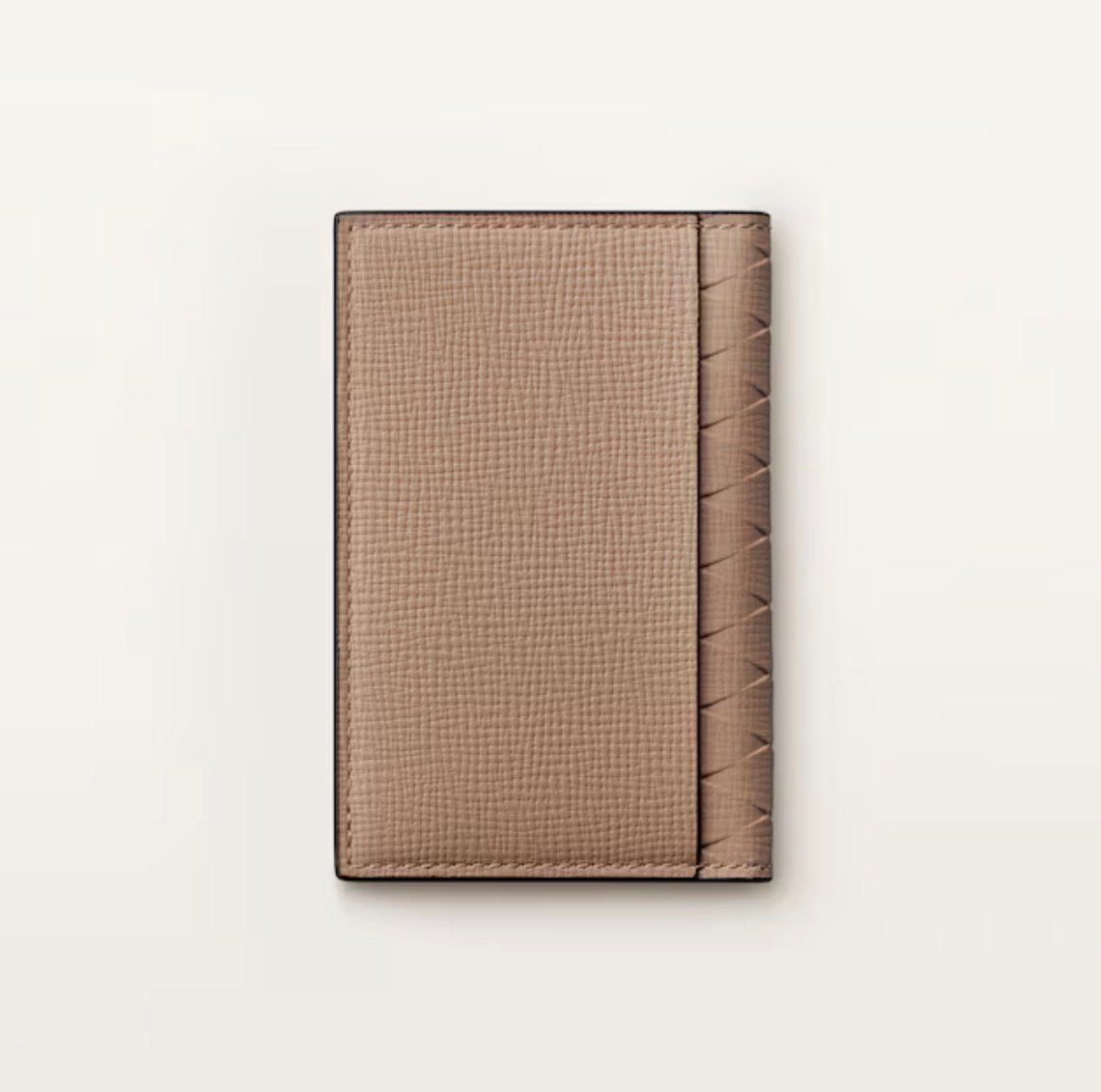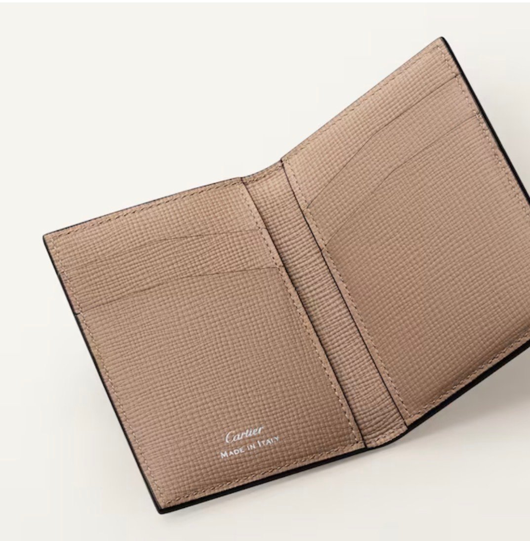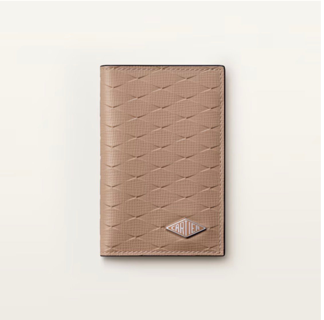 Losange four-credit card holder in latte-colored textured calfskin, latte-colored enamel and palladium-finish hardware. Exterior: Losange logo. Interior: latte-colored calfskin, silver-colored “Cartier” signature, four credit card slots, three flat pockets. Dimensions: Height: 70 mm. Width: 110 mm.