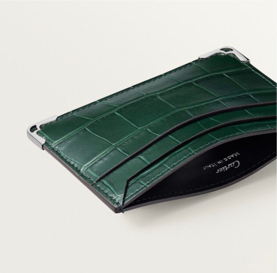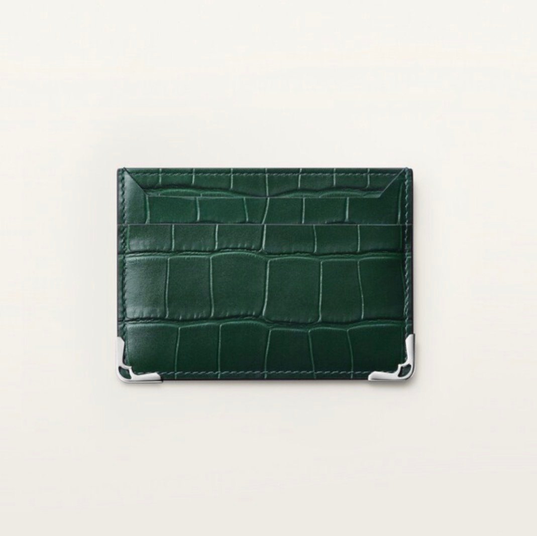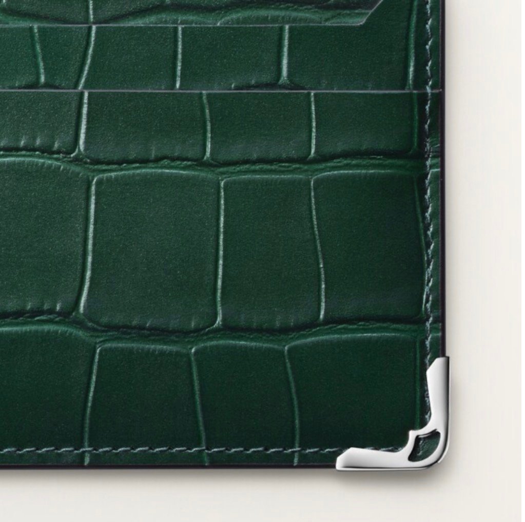 Must double card holder in green alligator leather. Exterior: palladium-finish metal corners. Interior: black calfskin, silver-colored Cartier signature, two flat credit card slots on the front and two pockets on the back, central pocket. Dimensions: Height: 75 mm. Width: 105 mm.