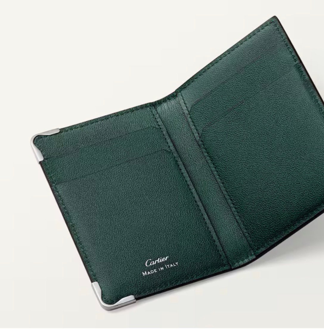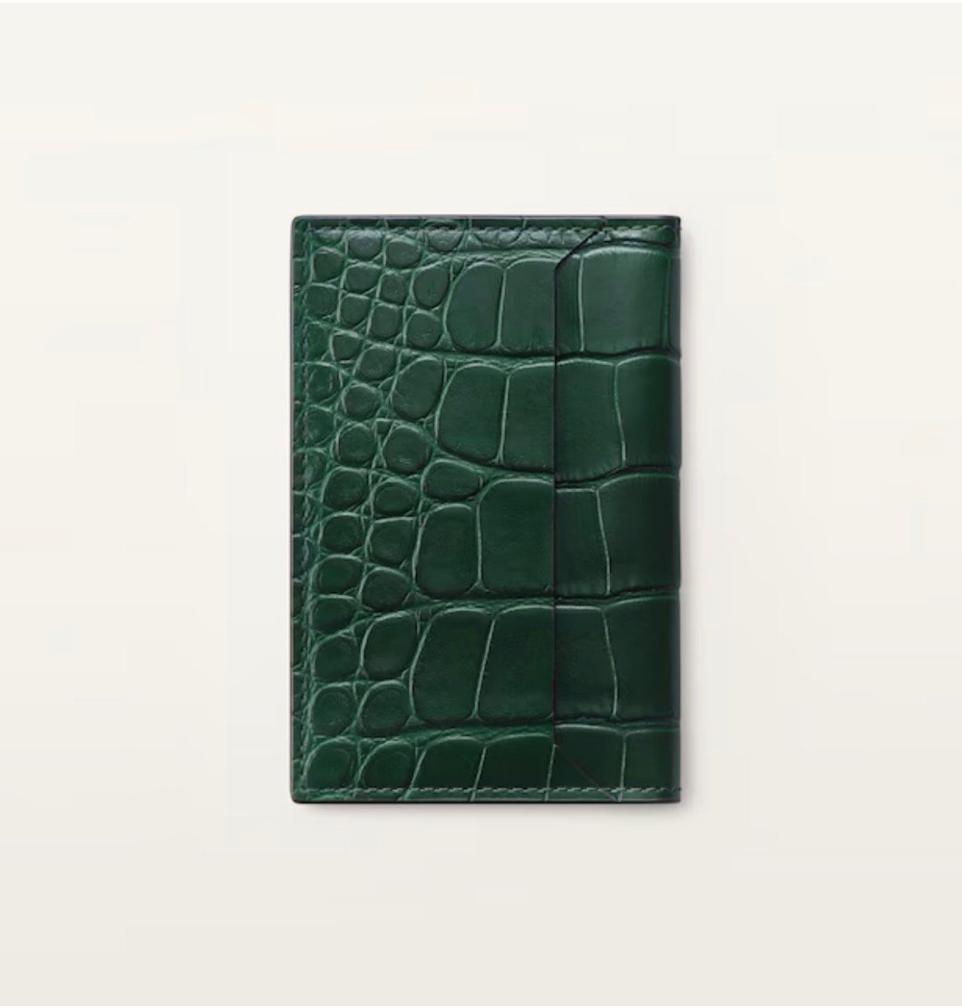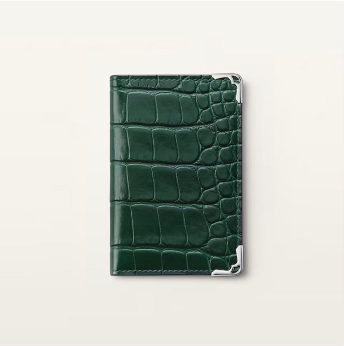 Must 4CC card holder in green alligator leather. Exterior: palladium-finish metal corners. Interior: green calfskin, silver-colored Cartier signature, four credit card slots, three flat pockets. Dimensions: Height: 107 mm. Width: 71 mm.