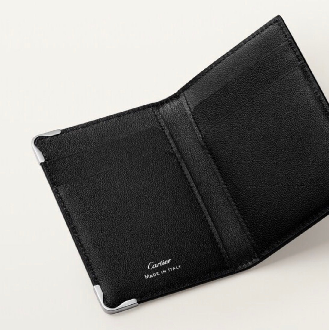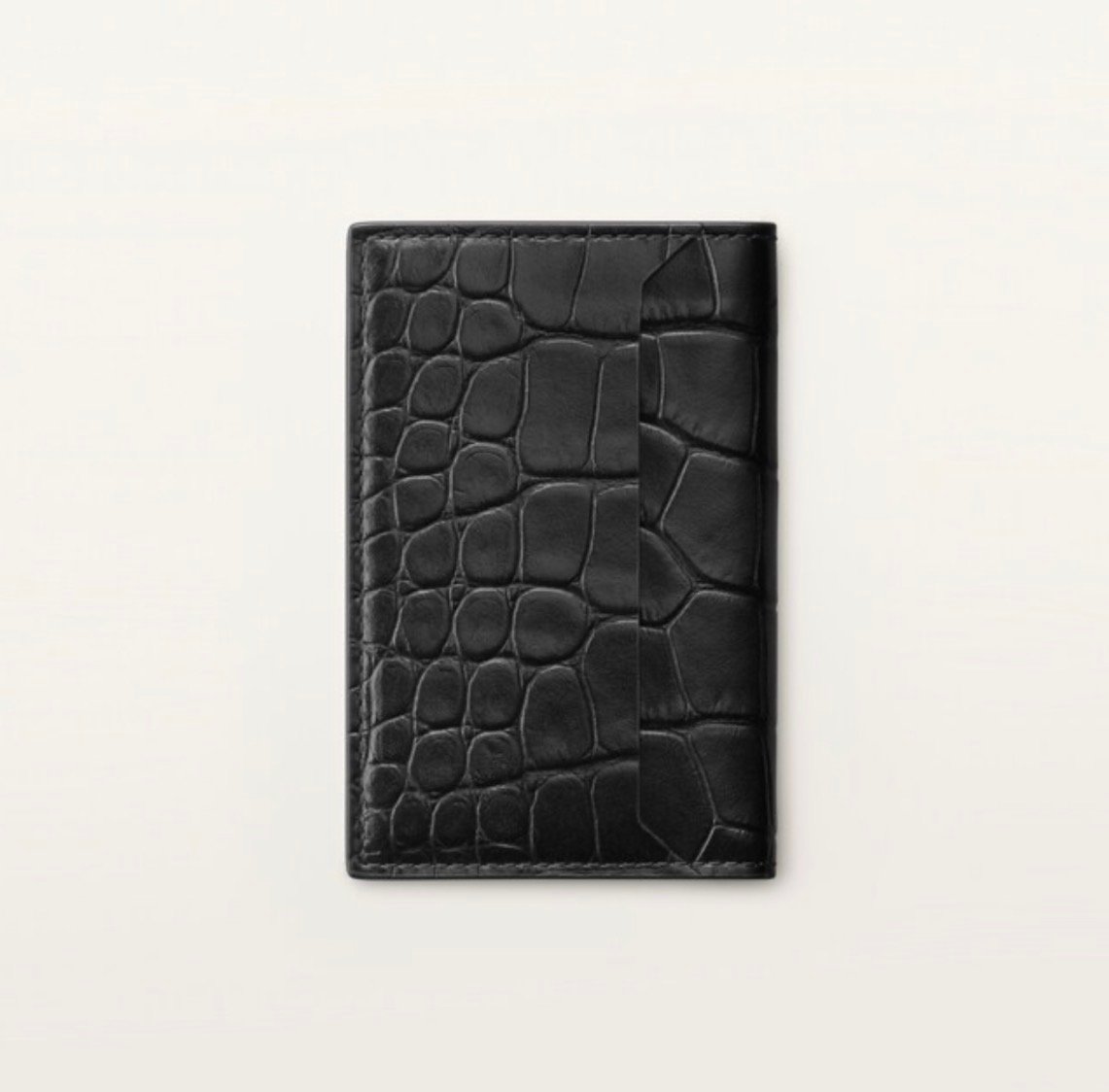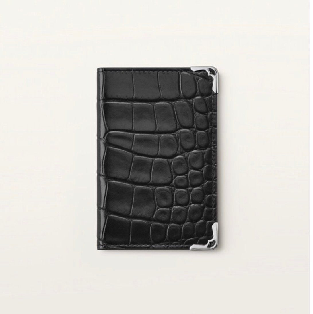 Must 4CC card holder in black alligator leather. Exterior: palladium-finish metal corners. Interior: black calfskin, silver-colored Cartier signature, four credit card slots, three flat pockets. Dimensions: Height: 107 mm. Width: 71 mm.