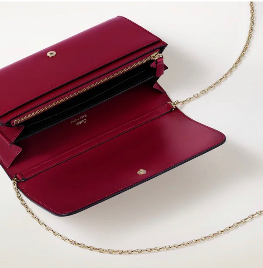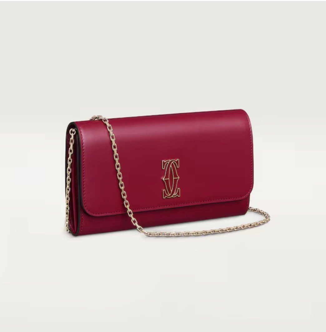 C de Cartier chain wallet with flap in cherry red calfskin, cherry red enamel and golden-finish Cartier signature. Interior: black lambskin, two gussets, eight credit card slots, one zipped coin pocket, one flat pocket, one central pocket, golden hot-stamped “Cartier” signature. Removable chain. Dimensions: length 190 mm x height 105 mm x depth 30 mm.