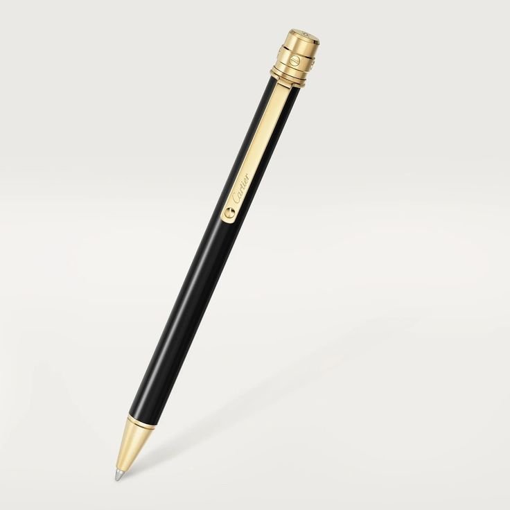 Santos de Cartier ballpoint pen, small model, black lacquer body, 18K gold (750/1000)-finish screw and details. Dimensions: 125 x 8 mm. Accompanied by a ballpoint pen cartridge, blue ink, medium size.