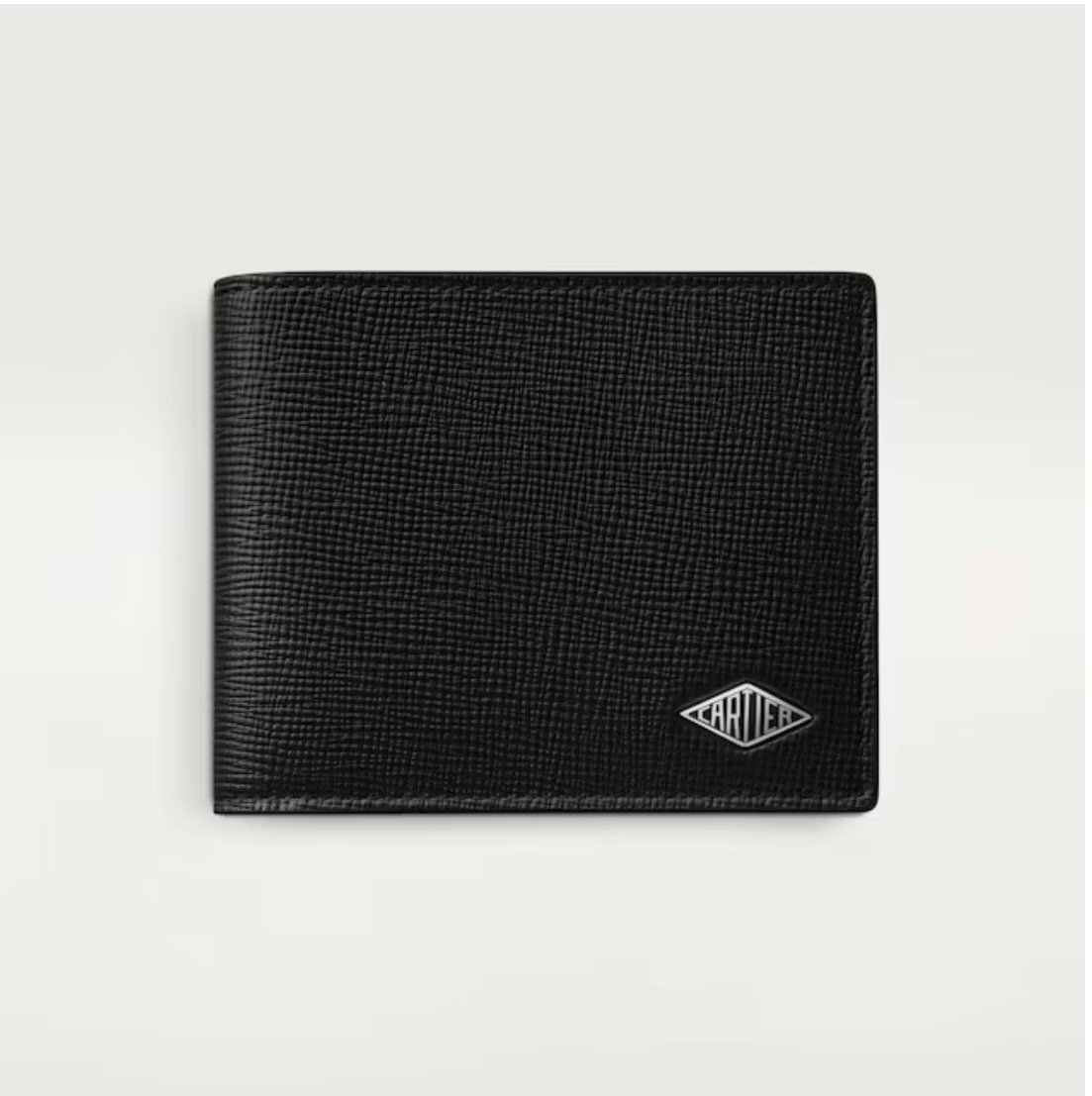 Losange six-credit card holder in black textured calfskin, black enamel and palladium finish. Exterior: Losange logo. Interior: black textured calfskin, six credit card slots, two banknote pockets. Dimensions: Height: 90 mm. Width: 120 mm.