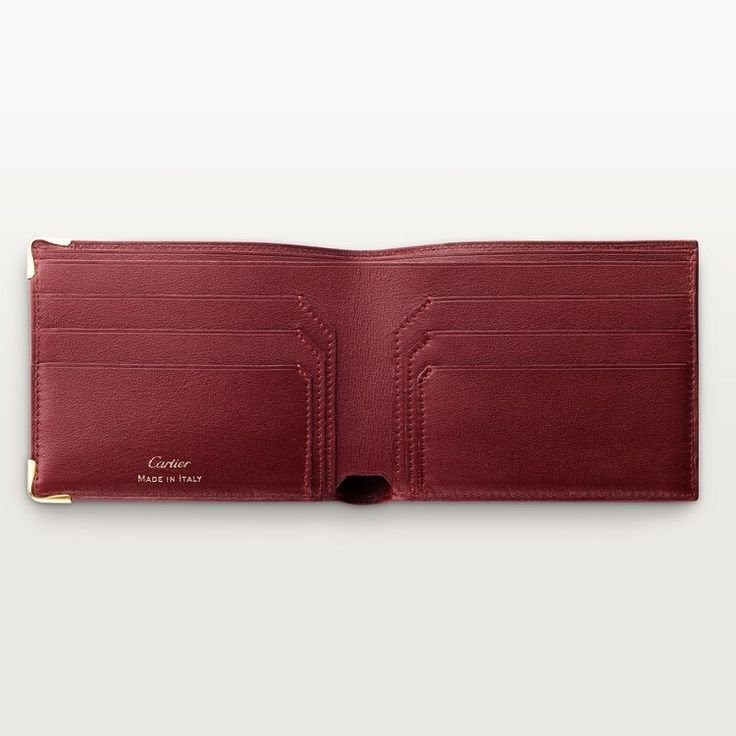 Burgundy calfskin 6-credit card wallet. Exterior: embossed double C logo, gold-finish metal corners. Interior: burgundy calfskin, gold-colored Cartier logo, six credit card slots, two banknote pockets. Dimensions: 91 mm high x 119 mm wide. This model may be made in Italy or Portugal.
