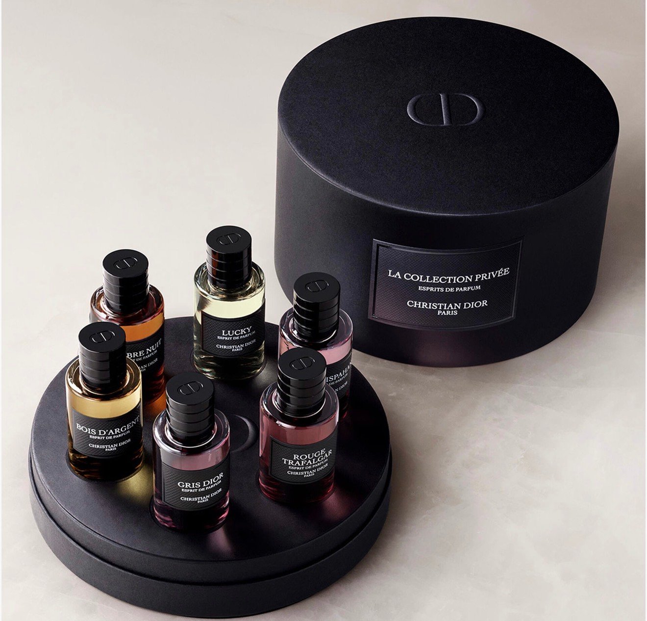 The set contains 6 bottles of the Esprits de Parfum in 7.5 ml format: new¹ Bois d’Argent, Gris Dior, Ambre Nuit, Oud Ispahan, Lucky and Rouge Trafalgar.