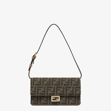 Iconic small Baguette® bag made of jacquard fabric with the iconic FF motif in brown, decorated with an FF clasp